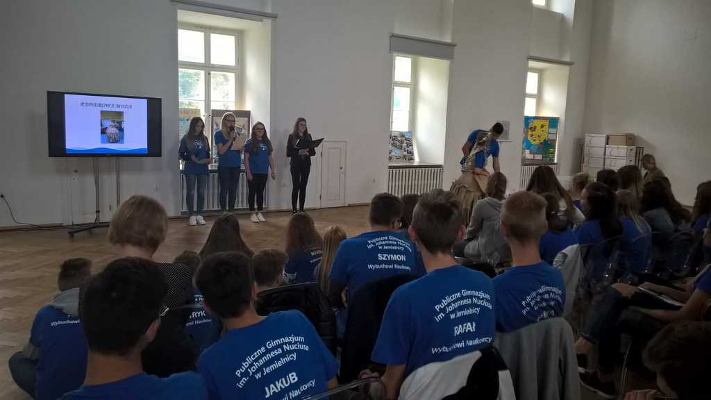 Badacze Wody z Publicznego Gimnazjum im. Johannesa Nuciusa w Jemielnicy 24.09.2017 roku pojechali do Warszawy, aby wziąć udział w Gali Badacza Wody, która odbyła się 25.09.2017 r. w Królewskich Łazienkach, i była rozstrzygnięciem międzynarodowego projektu Badacz Wody. Podczas gali uczniowie wraz z koordynatorem projektu panią Irmą Kubicą-Gabrysch zaprezentowali przed jury swoje całoroczne osiągnięcia na rzecz ochrony środowiska i oszczędzania wody. Gwoździem programu było przedstawienie piosenki „My te wody niebieskie…”, którą wykonały Katarzyna Sus i Mariola Kwas oraz strój wykonany z makulatury. Wśród 160 szkół, które brały udział w projekcie jemielniccy gimnazjaliści z klasy 3B zajęli tak jak w ubiegłym roku ich starsi koledzy drugie miejsce w Polsce. Jury wyróżniło Naszych uczniów za kreatywność i szerzenie wiedzy na temat oszczędzania wody wśród lokalnej społeczności organizując majowy Festiwal Wody oraz organizację cyklu zajęć dla jemielnickich przedszkolaków.