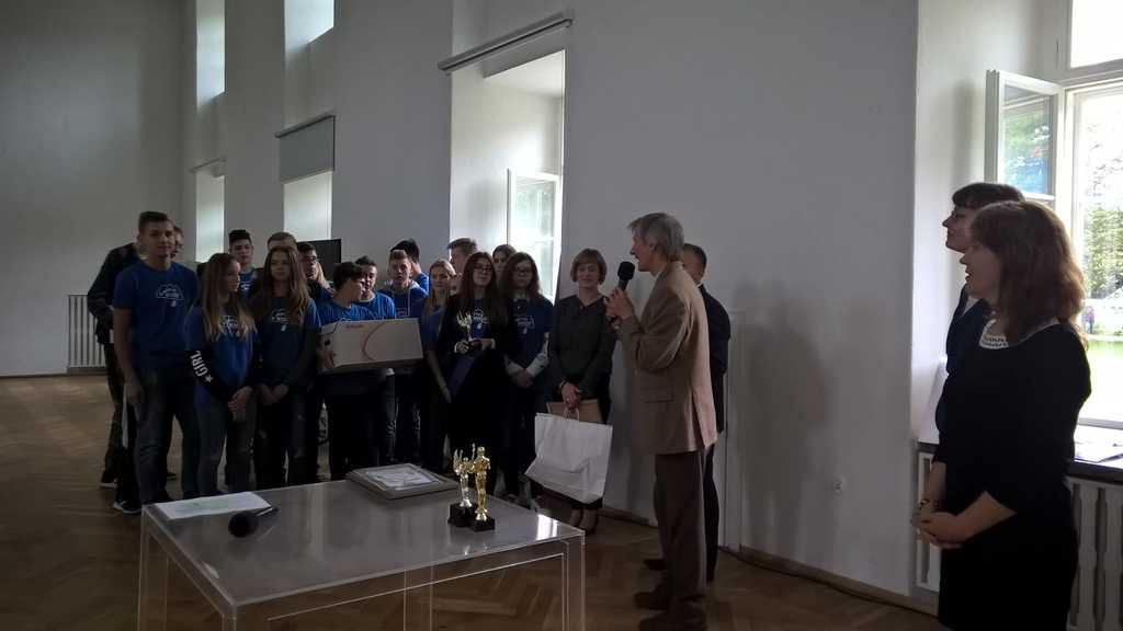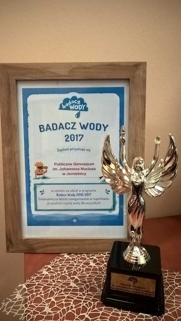 Badacze Wody z Publicznego Gimnazjum im. Johannesa Nuciusa w Jemielnicy 24.09.2017 roku pojechali do Warszawy, aby wziąć udział w Gali Badacza Wody, która odbyła się 25.09.2017 r. w Królewskich Łazienkach, i była rozstrzygnięciem międzynarodowego projektu Badacz Wody. Podczas gali uczniowie wraz z koordynatorem projektu panią Irmą Kubicą-Gabrysch zaprezentowali przed jury swoje całoroczne osiągnięcia na rzecz ochrony środowiska i oszczędzania wody. Gwoździem programu było przedstawienie piosenki „My te wody niebieskie…”, którą wykonały Katarzyna Sus i Mariola Kwas oraz strój wykonany z makulatury. Wśród 160 szkół, które brały udział w projekcie jemielniccy gimnazjaliści z klasy 3B zajęli tak jak w ubiegłym roku ich starsi koledzy drugie miejsce w Polsce. Jury wyróżniło Naszych uczniów za kreatywność i szerzenie wiedzy na temat oszczędzania wody wśród lokalnej społeczności organizując majowy Festiwal Wody oraz organizację cyklu zajęć dla jemielnickich przedszkolaków.